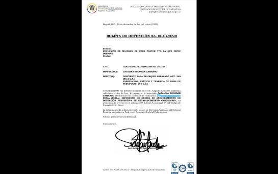 El juzgado 53 de garantías de Bogotá envió a prisión a Catalina Escobar Camargo, alias ‘Angie’, señalada de ser la mano derecha de alias ‘Roñama’ y una de las presuntas guerrilleras que aparece en el video de ‘Iván Márquez’ cuando dio a conocer su grupo disidente denominado ‘La Segunda Marquetalia’.