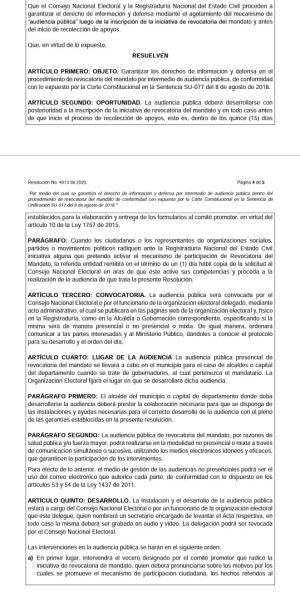 Precisamente, y en el siguiente artículo (259) del Código, se precisa que "el Consejo Nacional Electoral presidirá la audiencia pública, destinara hasta 30 minutos al promotor y al alcalde para que hagan su intervención, y garantizara el cumplimiento del derecho al debido proceso. Los demás intervinientes podrán participar hasta por 15 minutos en la audiencia".