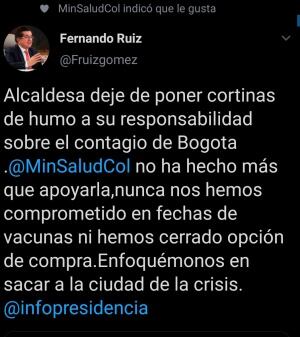 "Alcaldesa deje de poner cortinas de humo a su responsabilidad sobre el contagio de Bogota. @MinSaludCol no ha hecho más que apoyarla, nunca nos hemos comprometido en fechas de vacunas ni hemos cerrado opción de compra. Enfoquémonos en sacar a la ciudad de la crisis", escribió el ministro de salud.