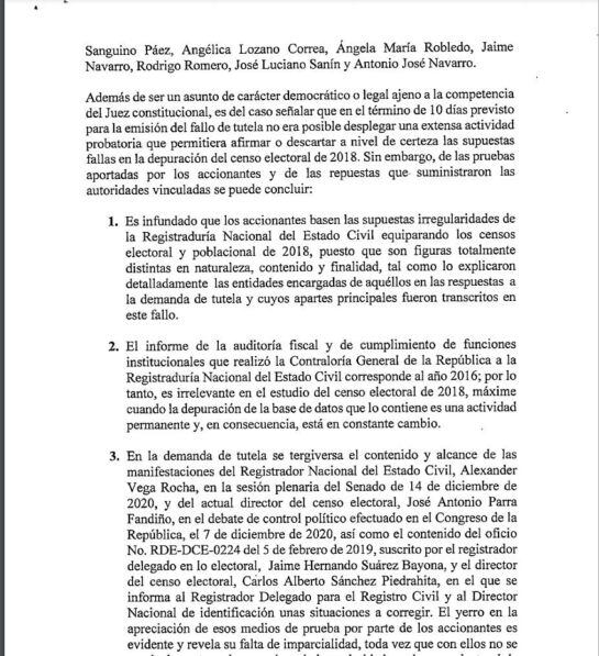 El juez calificó de infundado que los accionantes basen sus pretensiones equiparando los censos poblacional y electoral porque son figuras que tienen naturaleza y finalidad distintas y no es correcto atribuir de manera absoluta todas las falencias del censo electoral a la Registraduría, dado que para su depuración es necesario que otras autoridades remitan oportunamente la información de las personas que no están inhabilitadas para votar.