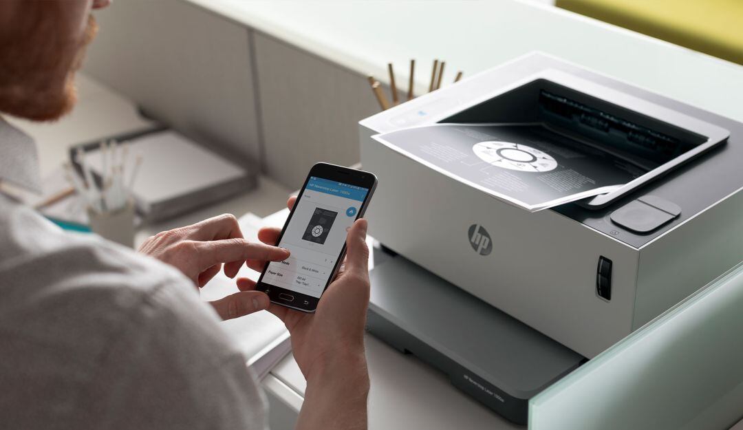 Para mejorar el rendimiento de las empresas, la HP Neverstop Laser 1000wcuenta con la tecnología adecuada para imprimir fácilmente desde un dispositivo móvil, a través de la aplicación HP Smart.