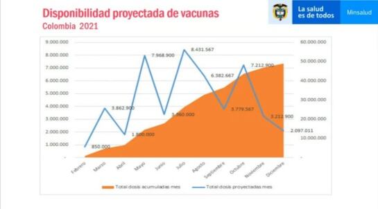 El ministerio también explicó a través de una gráfica la disponibilidad proyectada de vacunas durante todo el año, en donde dejó ver que mayo (7.968900 dosis), julio (8.431.567) y octubre (7.212900) serán los meses en los que más vacunas lleguen al país. No obstante anticipó que los meses con estimados más bajos podrían aumentarse con nuevas negociaciones de los antídotos.