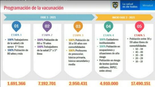 El Ministerio de Salud presentó el proyecto de decreto, actualmente en etapa de borrador y que ha sido presentado a las distintas autoridades locales y departamentales para su socialización y comentarios, mediante el cual se define el plan nacional de vacunación y establece que en 2021 se vacunarán más de 34 millones de ciudadanos.