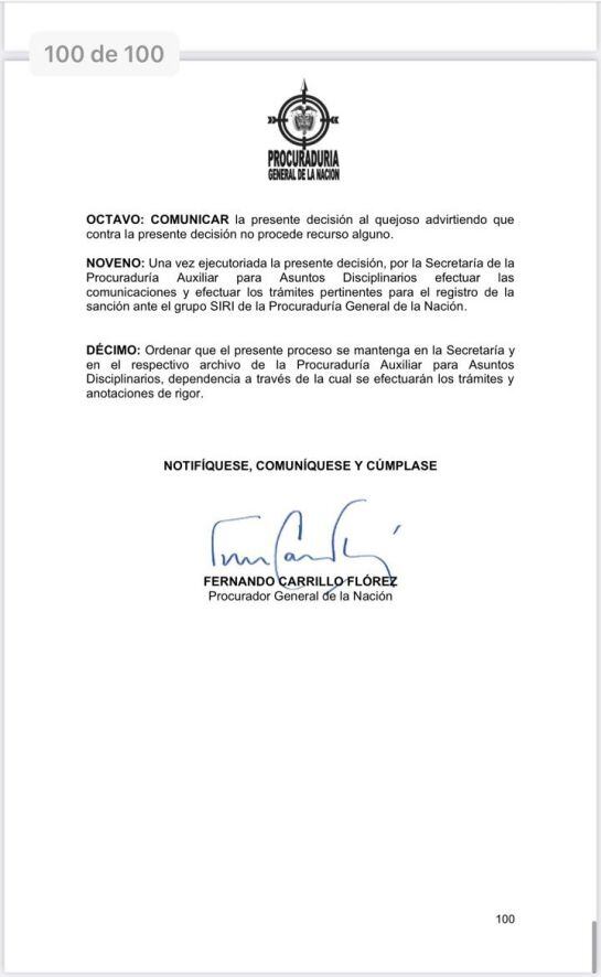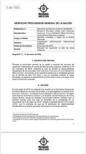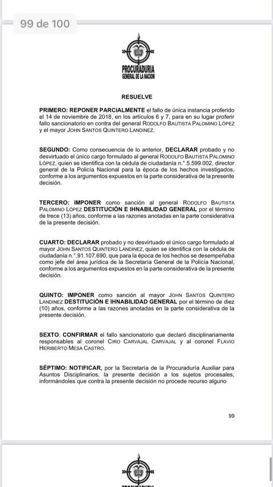 La Procuraduría General de la Nación lo sancionó al exdirector de la Policía, Rodolfo Palomino, por ser el que organizó una reunión para ejercer presión contra otro oficial de la Institución, al que querían obligar a que se retractara de algunas imputaciones en contra del general retirado.