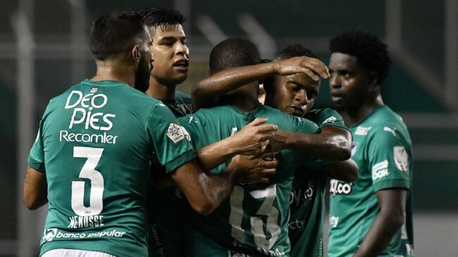 Los jugadores del Cali festejan el gol de Juan Camilo Angulo. / @Dimayor