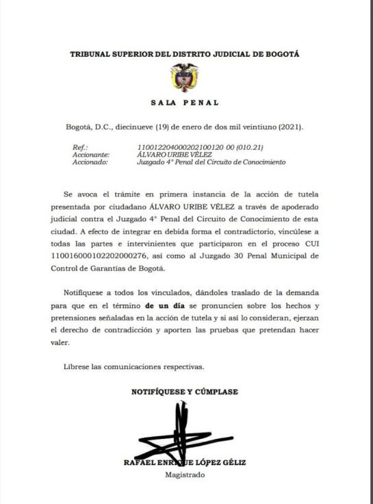El Tribunal Superior de Bogotá admitió para su estudio la tutela con la cual el exsenador y expresidente Álvaro Uribe pretende tumbar la calidad de imputado que le endilgó un juez.