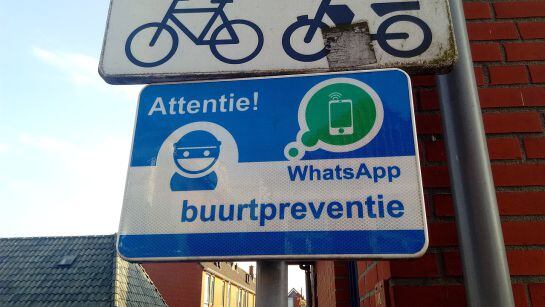 Un letrero que indica que este vecindario está siendo vigilado por WhatsApp, en la ciudad de Appingedam en Groninger. / Donald Trung Quoc Don (Chữ Hán: 徵國單) - Wikimedia Commons - © CC BY-SA 4.0 International.