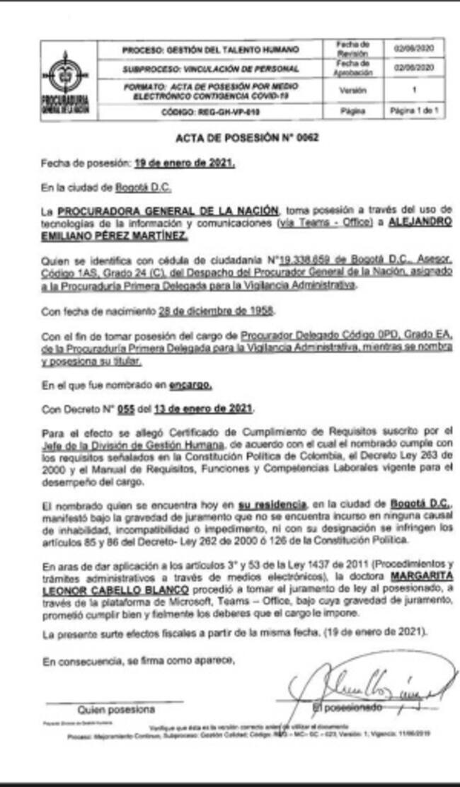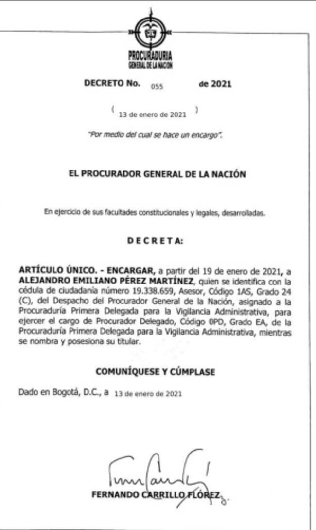 También señalaron que: “Uno de los casos que entrará a revisión será la decisión firmada el pasado 22 de enero por Alejandro Emilio Pérez Martínez quien firmó como procurador primero delegado para la Vigilancia administrativa, el mismo día en qué fue posesionada Sonia Téllez como la procuradora delegada para ese cargo”. El fallo que firmó Pérez trata de la decisión de investigar a los funcionarios del gobierno de Iván Duque.