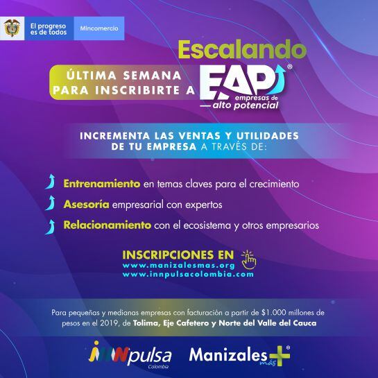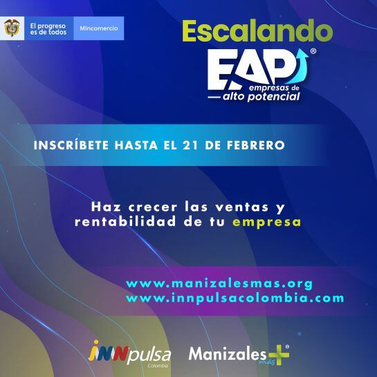 Este programa ha sido realizado por “Manizales Más” por más de 8 años, durante los cuales se han acompañado más de 100 empresas que crecen en promedio un 38% ventas durante su año de entrenamiento. Para este año se seleccionará un grupo de pequeñas y medianas empresas del Eje Cafetero, Tolima y Norte del Valle con ventas a partir de mil millones de pesos anuales y que tengan Alto Potencial de crecimiento, con el fin de generarles nuevas capacidades, apoyarlas con asesoría empresarial, entrenarlas en temas claves para el crecimiento y relacionarlas con el ecosistema y otros empresarios.