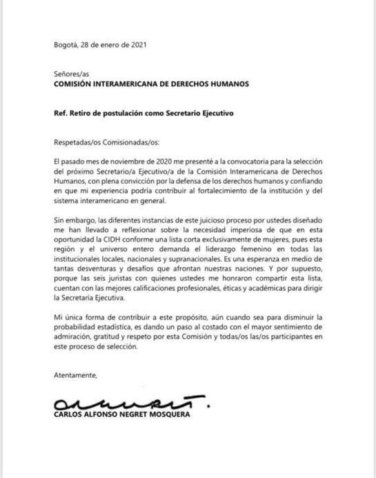 El exdefensor del Pueblo, Carlos Negret, que en noviembre del año 2020, se presentó a la convocatoria para la selección del próximo secretario ejecutivo de la Comisión Interamericana de Derechos Humanos, (CIHD), retiró su postulación porque quiere que sea una mujer la que este en este cargo.
