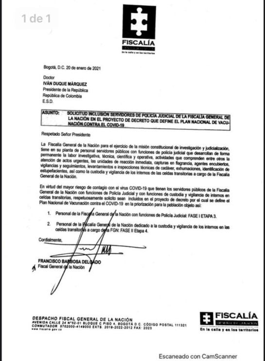 En el documento dice que la Fiscalía para el ejercicio de la misión constitucional de investigación y judicialización tiene en su planta servidores que desarrollan labor investigativa, científica y técnica y que por ello tienen mayor riesgo de contagio de covid-19, y por ello piden esa priorización en el Plan Nacional de Vacunación.