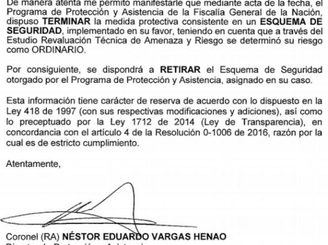 “Por consiguiente, se dispondrá a retirar el esquema de seguridad otorgado por el Programa de Protección y Asistencia asignado a su caso”, se lee en la notificación.