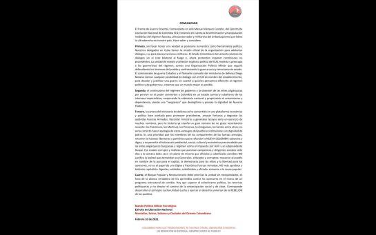 "Después de verificar con todas las estructuras guerrilleras del Ejército de Liberación Nacional (Eln), clarificamos que la información que recibió la Embajada de Cuba en Bogotá no hace parte de los planes militares del Eln, y es posible que se trate de un falso positivo montado por la inteligencia militar del Estado colombiano", afirma el documento..