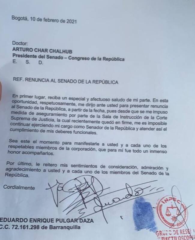 “Me dirijo ante usted para presentar renuncia al Senado de la República, a partir de la fecha, pues desde que se me impuso medida de aseguramiento por parte de la Sala de Instrucción de la Corte Suprema de Justicia, la cual recientemente quedó en firme, me es imposible continuar ejerciendo mi cargo como Senador de la República y atender así el cumplimiento de mis deberes funcionales”, dice la carta que tiene fecha del 10 de febrero.