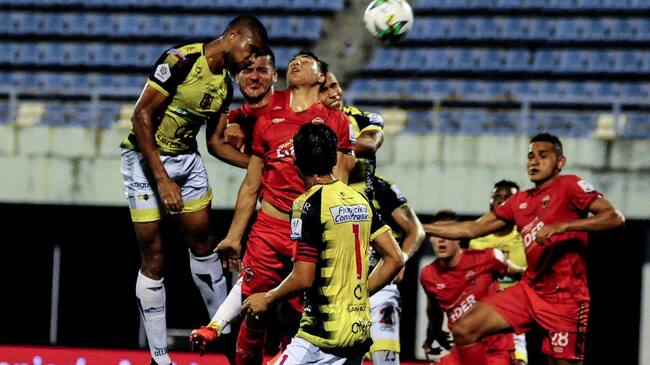 Los jugadores de Alianza Petrolera y Patriotas disputan un balón aéreo durante un juego de la Liga del año pasado. / Colprensa