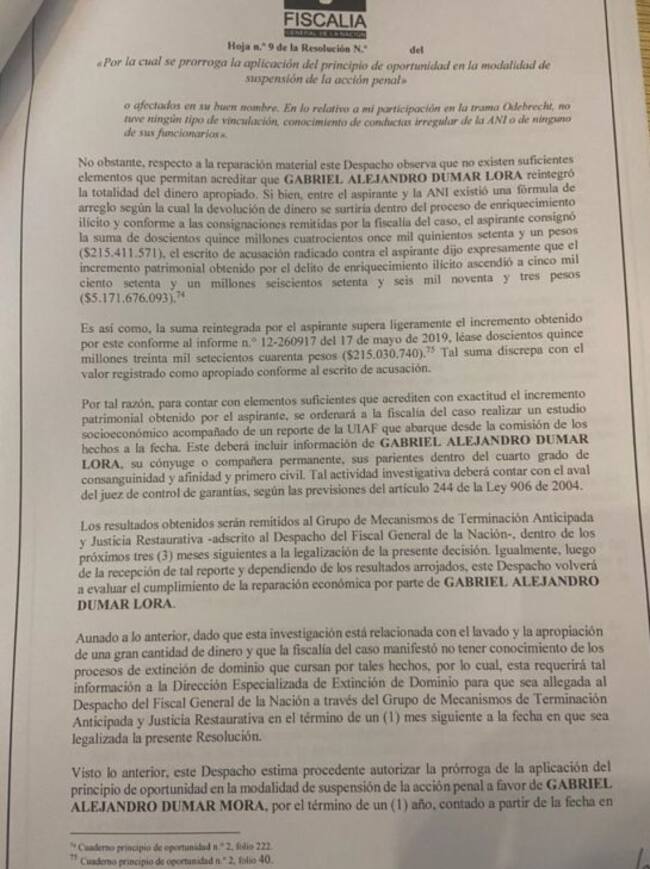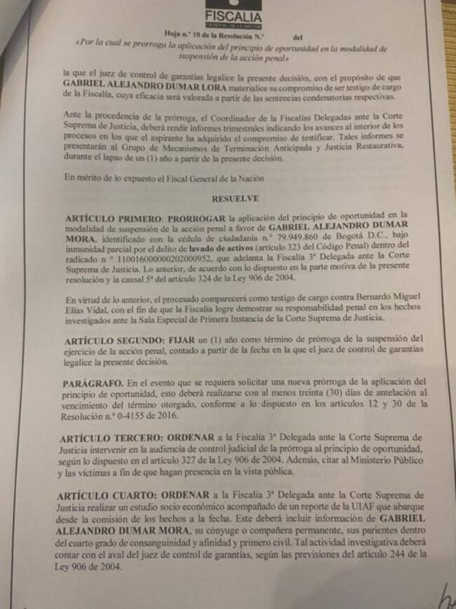 El principio de oportunidad también ordena a la Fiscalía tercera delegada ante la Corte realizar un estudio al patrimonio de Gabriel Dumar. Ese estudio debe estar acompañado de un informe de la Unidad de Investigación y Análisis Financiero (UIAF) que abarque información no solo del procesado, también de su esposa, sus parientes dentro del cuarto grado de consanguinidad y por supuesto, debe ser avalado por un juez de la República.