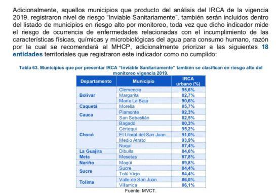 Tras el informe de Monitoreo y Control a los Recursos del Sistema General de Participaciones hecho por el Ministerio de Vivienda, Ciudad y Territorio del Viceministerio de Aguas arroja que 25 municipios en Bolívar, 36 de Boyacá y Tolima, 32 de Cauca y Chocó, 45 de Cundinamarca, Nariño y Santander, 13 de Magdalena, 12de Antioquia, entre otros, están en nivel alto de riesgo frente al manejo de los recursos públicos destinados agua potable.