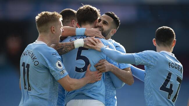 Los jugadores del Manchester City festejan el gol de la victoria convertido por Stones. / Getty Images