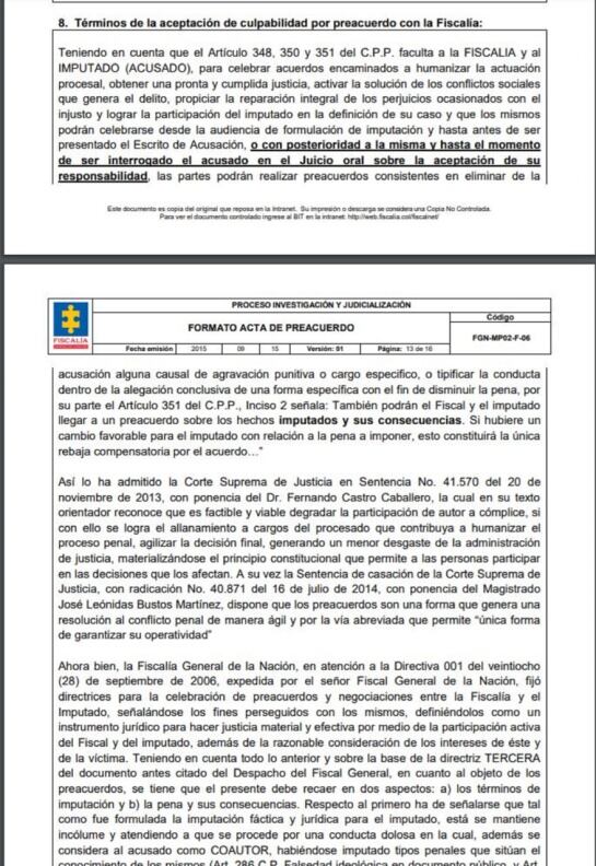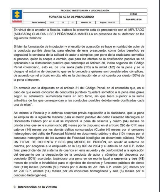 El preacuerdo conocido por Caracol Radio señala que, Claudia Lizeth Peñaranda, más conocida como la ‘tramitadora’ del INVIMA, acepta los delitos de falsedad material en documento público y Falsedad ideológica en documento público en calidad de partícipe. La pena contemplada sería de 37 meses de prisión, pena que fue modificada y que se acordó de manera verbal ante un juez.