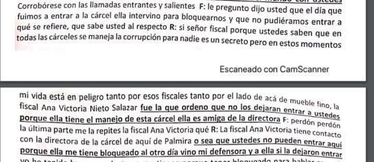 Testigo: Sí señor fiscal, porque ustedes saben que en todas las cárceles del país se maneja la corrupción, para nadie es un secreto, pero en estos momentos mi vida está en peligro tanto por esos fiscales, tanto por el lado de acá de ‘Mueble Fino’. La Fiscal Ana Victoria Salazar fue la que ordenó que no los dejaran entrar a ustedes porque ella tiene el manejo de esta cárcel, ella es amiga de la directora.