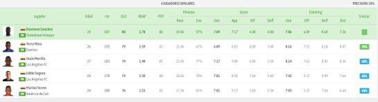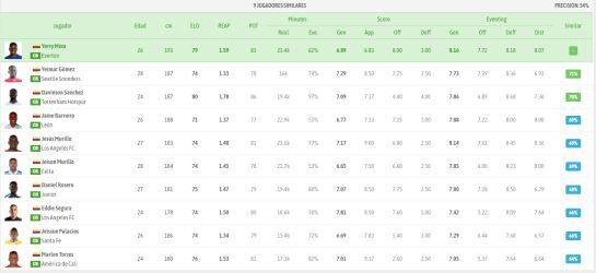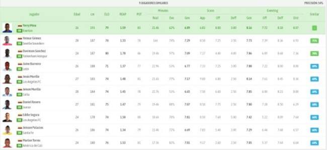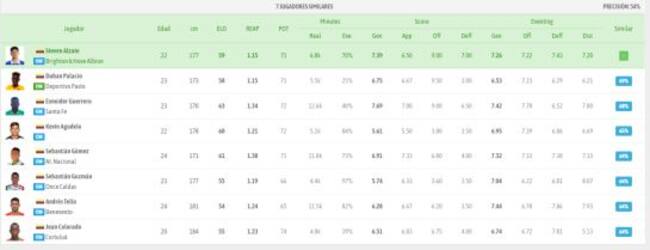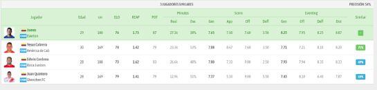 Además, la aplicación postula como jugadores similares a Edwin Cardona de Boca Juniors y a Juan Fernando Quintero del Shenzhen FC de China. Estos tienen un porcentaje de similitud del 69% y 63%, respectivamente.