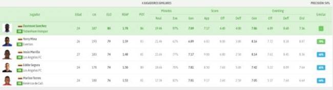 Aunque la temporada en Estados Unidos aun no ha iniciado, Eddie Segura fue líder defensivo de su equipo disputando 30 partidos entre Concacaf Champions League, donde fueron finalistas, y la Major League Soccer. El único jugador de la Liga Colombiana presente entre las similitudes es Marlon Torres del América de Cali.