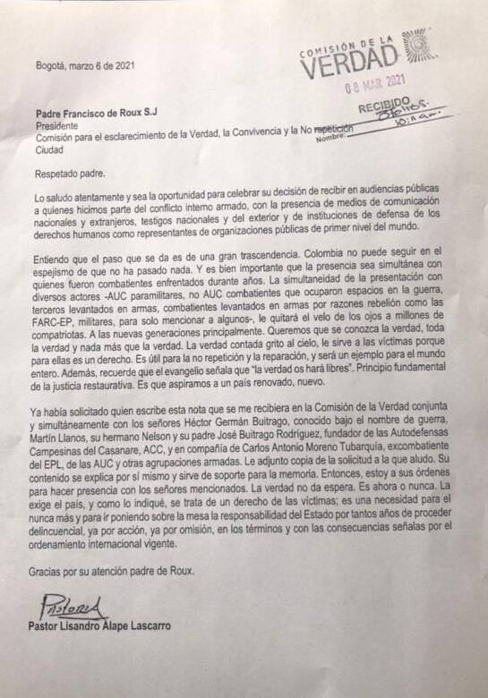 En carta dirigida al padre Francisco de Roux, le dice que quiere hablar de manera conjunta con paramilitares, terceros levantados en armas y militares