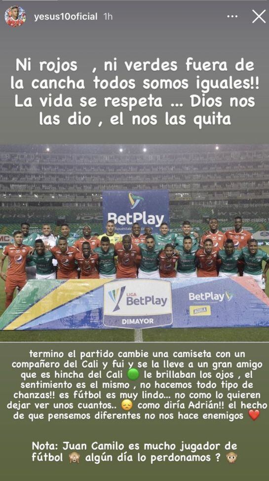 "Ni rojos, ni verdes, afuera de la cancha todos somos iguales!! La vida se respeta... Dios nos la dio, el nos la quita", dice un fragmento del texto publicado por Yesus que además iba acompañada por una imagen de los jugadores de ambos equipos mezclados en el último clásico vallecaucano.
