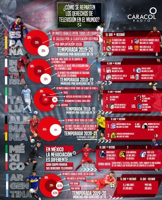 A continuación, hacemos un repaso con los datos de repartición de los derechos de televisión en las diferentes ligas del mundo, haciendo énfasis en la situación del fútbol colombiano, donde la discusión con los equipos grandes por cambiar la forma de repartir los derechos de TV ha sido una constate de los últimos años.