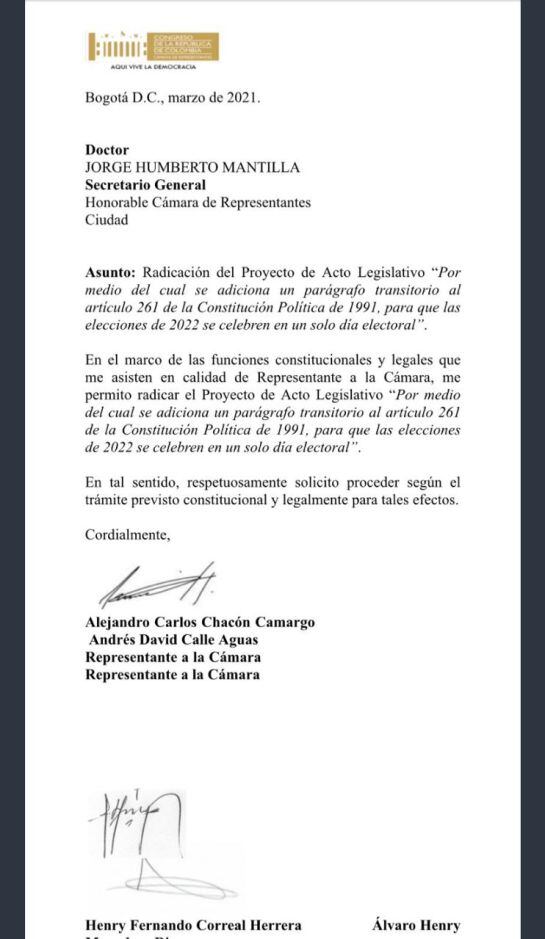 Un día después de hundirse el proyecto que buscaba prolongar los mandatos de presidente, congresistas, autoridades locales, judiciales y entes de control, se conoció el texto de una iniciativa, que adelanta el representante liberal Alejandro Chácon, con el fin de realizar las elecciones legislativas y la primera vuelta de las presidenciales en una sola fecha, en mayo del 2022.