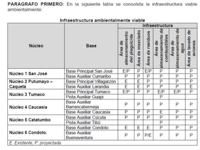 En la resolución 00694 de la ANLA, que avaló el Plan de Manejo Ambiental de la Policía Nacional, se habla de 12 bases policiales: tres principales (San José, Villagarzón y Tumaco), ocho auxiliares (Cumaribo, Larandia, Guapi, Barrancabermeja, Caucasia, Cúcuta, Condoto y Buenaventura) y una pista auxiliar en Tibú, Norte de Santander.