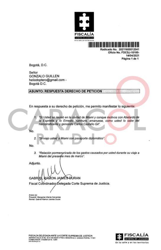 Caracol Radio conoció la respuesta al derecho de petición que entrego el fiscal Jaimes al periodista Guillén, en el que niega haber sostenido estos encuentros. Además aseguró que no viajó a Miami con un pasaporte diplomático.
