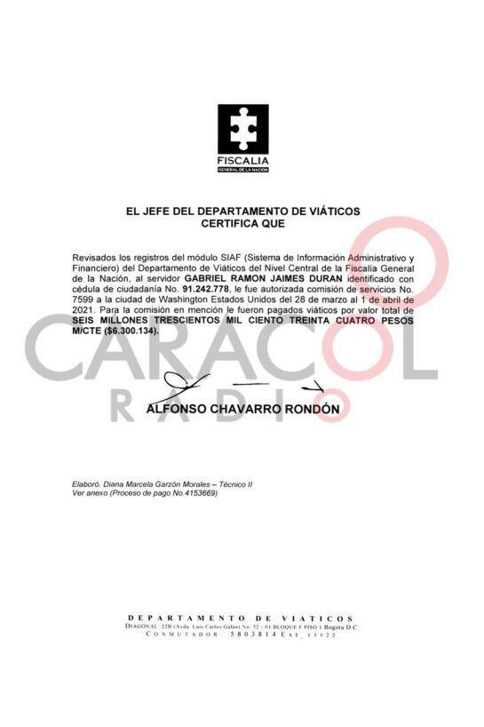 El fiscal no estuvo en Miami, sino en Washington como lo confirma una certificación firmada por el jefe del departamento de viáticos de la Fiscalía que publica Caracol Radio, que demuestra que fueron entregados $6 millones 300 mil pesos para la comisión que estuvo en la capital norteamericana del 18 de marzo al 1 de abril, teniendo en cuenta los registros del Sistema de Información Administrativo y Financiero de la entidad.