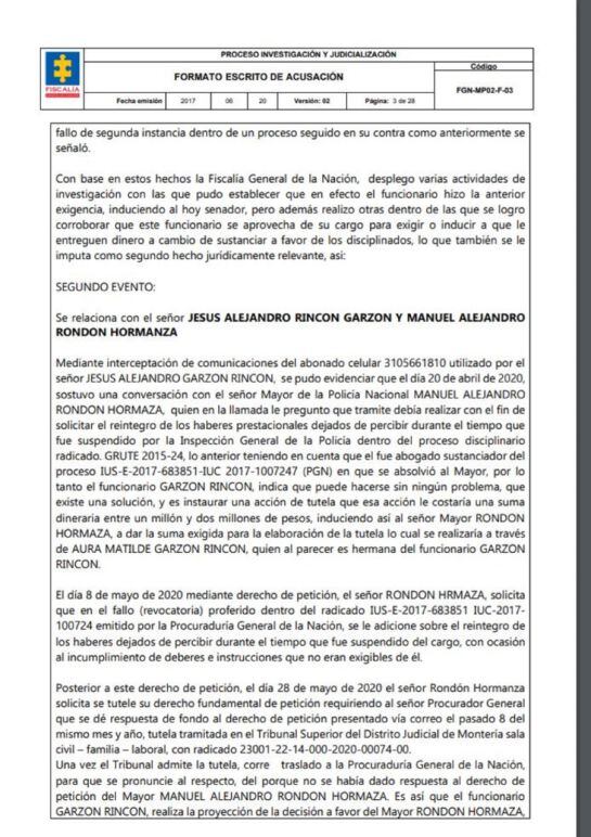 También, en ente acusador se mantiene en que habría asesorado al mayor de la Policía Manuel Rondón Hormaza en una tutela contra la Procuraduría para solicitar el reintegro de prestaciones dejados de recibir durante el tiempo que estuvo suspendido por un proceso disciplinario, asesoría por la que habría cobrado $5 millones.