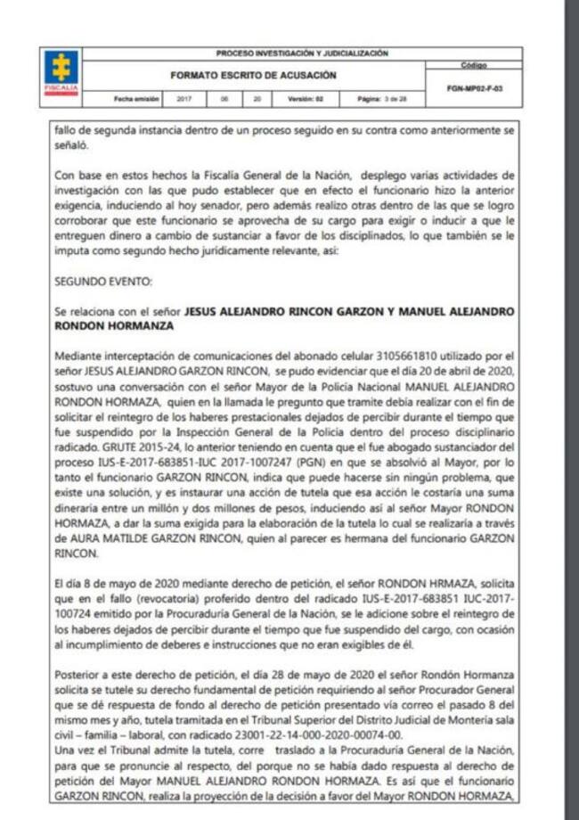 “Con base en estos hechos, la Fiscalía General de la Nación desplegó varias actividades de investigación con las que pudo establecer que en efecto el funcionario hizo la anterior exigencia, induciendo al hoy senador”.