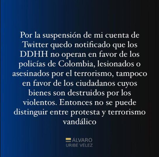 “Por la suspensión de mi cuenta de Twitter quedo notificado que los DDHH (Derechos Humanos) no operan en favor de los policías de Colombia, lesionados o asesinados por el terrorismo, tampoco en favor de los ciudadanos cuyos bienes son destruidos por los violentos”, expresó el exsenador.