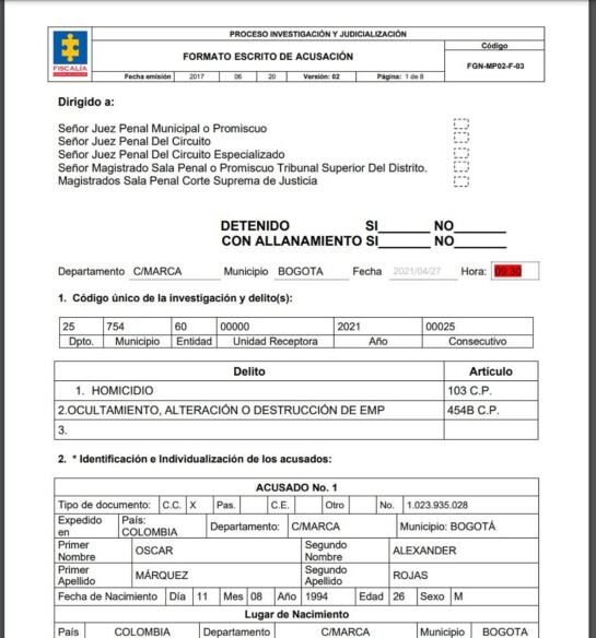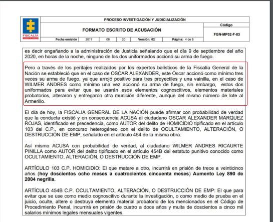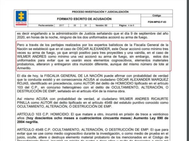 La Fiscalía lo acusa del delito de homicidio y según el documento, le adicionó el delito de ocultamiento y alteración de pruebas, cargo que también le fue imputado al patrullero Wilmer Andrés Ricaurte en calidad de autores.