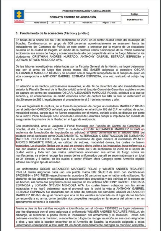 La noche de las protestas en ese sector, varios uniformados dispararon sus armas de dotación y por ello se ordenó recoger todas las armas para inspección. Señala el ente acusador que, los dos policías implicados acudieron al Armerillo de Soacha para cambiar la munición asignada y hacerle creer a la administración de justicia que ninguno de los dos había disparado.