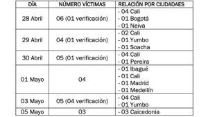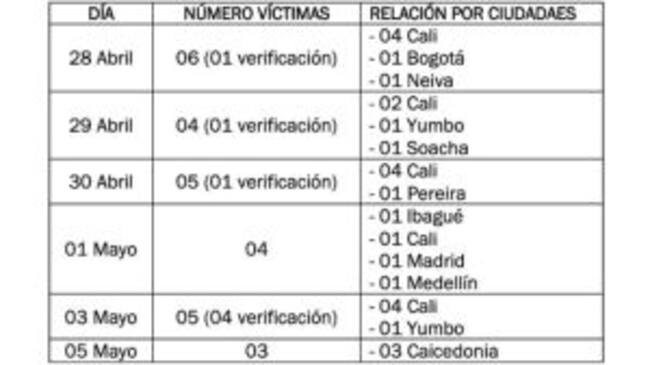 Un informe del Ministerio de Defensa, con corte al 7 de mayo, dio a conocer que durante las protestas en el país fallecieron 27 personas. De los casos que se han presentado, la mayoría han ocurrido en Cali, allí se han presentado 17 muertes siendo el 28 de abril el día con mas fallecimientos.