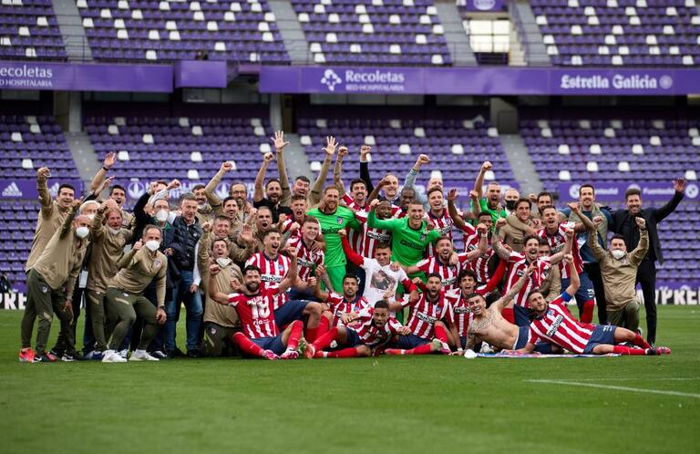 Celebración grupal de los jugadores de Atlético Madrid en el estadio José Zorrilla