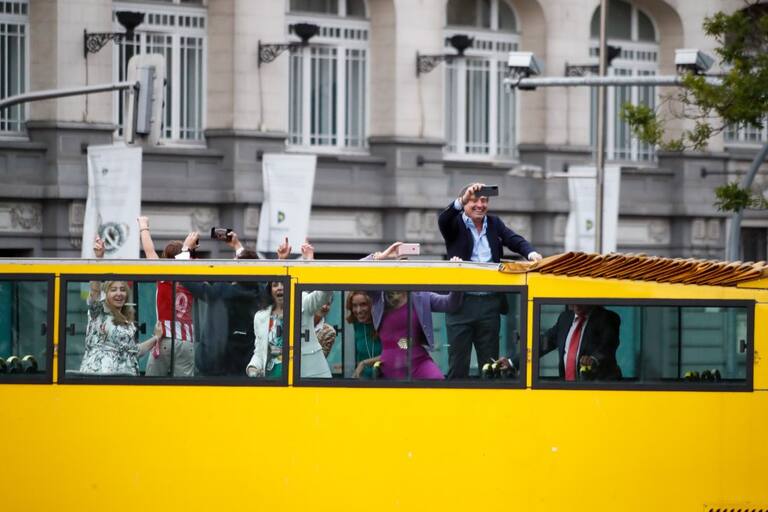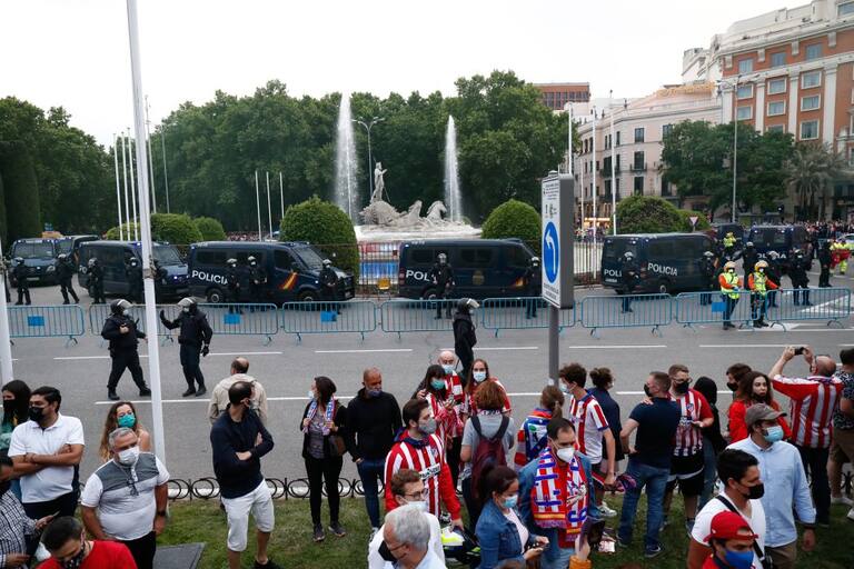 Festejo de hinchas del Atlético Madrid en inmediaciones a la Fuente de Neptuno