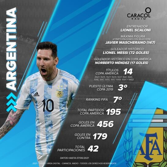 Argentina es la segunda selección con más títulos de la Copa América, de hecho cuando ganó su último certamen lideraba el historial, en 1993. El equipo de Lionel Messi espera terminar con la sequía en el torneo en Brasil. La Albiceleste ha participado en 42 ediciones de la Copa, con un saldo de 14 títulos, 195 partidos y 456 goles marcados. Su máximo goleador en la Copa es Norberto Méndez con 17 tantos.