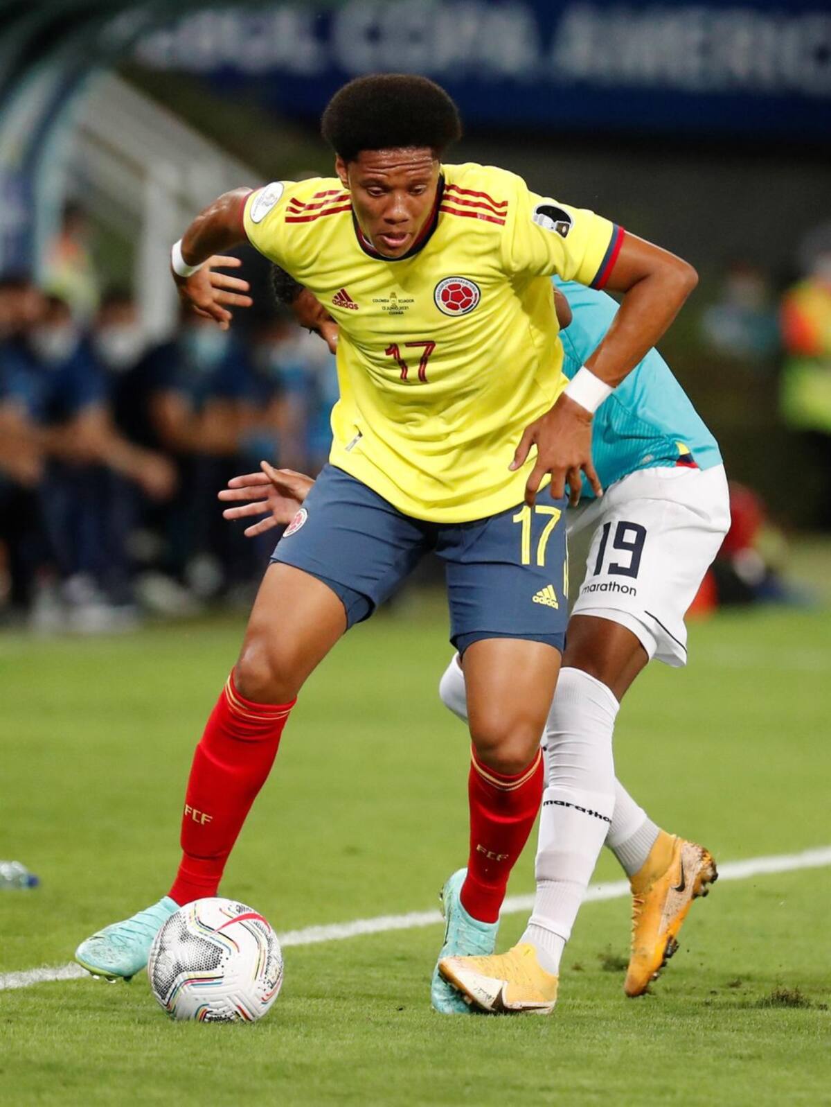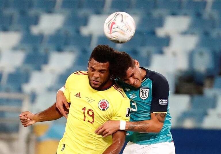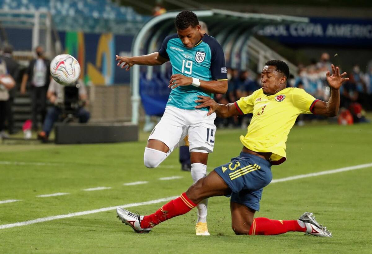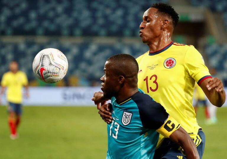 Yerry Mina y Enner Valencia en una disputa por el balón
