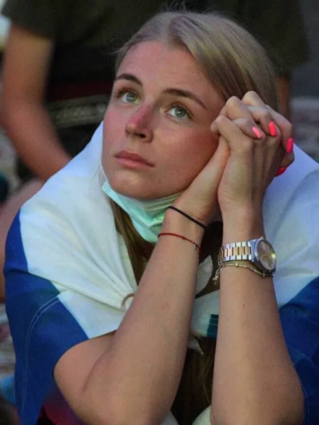 Foto 6 de 10Hincha rusa en la 'fan zone' de San Petersburgo mira la retransmisión del partido de la fase de grupos de la Eurocopa 2020 entre las selecciones de Rusia y Dinamarca, en el que los rusos perdieron ante los daneses 1-4.