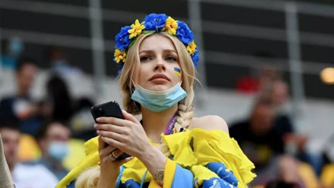 Foto 7 de 10Aficionada ucraniana durante el partido de la fase de grupos de la Eurocopa 2020 entre las selecciones de Ucrania y Macedonia del Norte en Bucarest, que terminó con una victoria de 2-1 para los ucranianos.