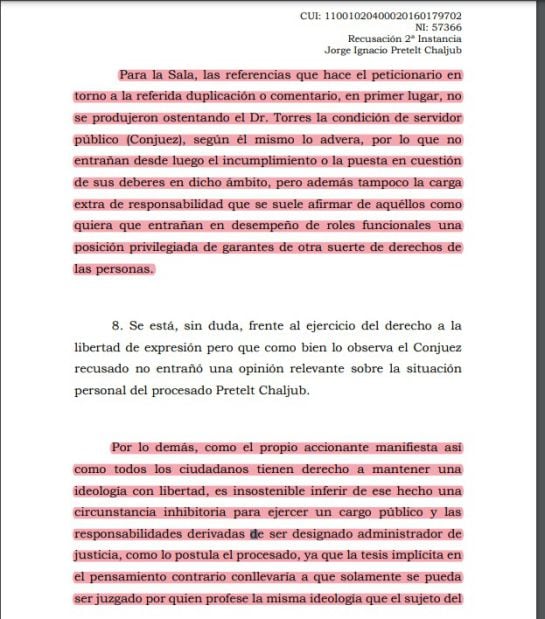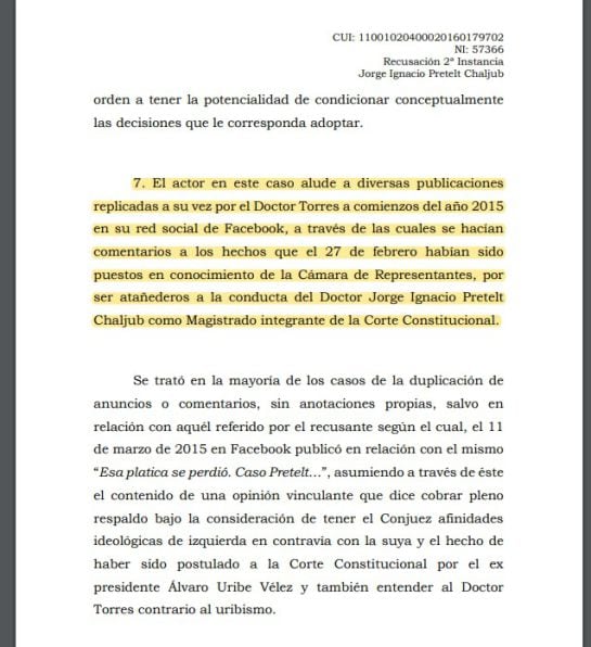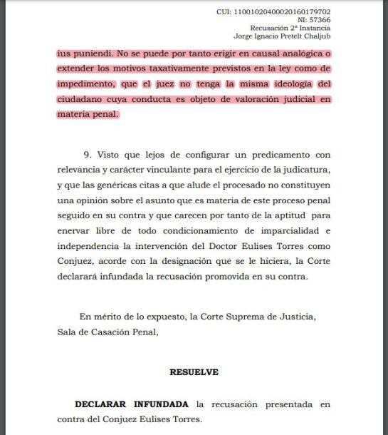 Además, Pretelt, señala al conjuez Torres de supuestamente tener ideología de izquierda, un detractor del uribismo y la derecha, además de haber comprometido su imparcialidad.