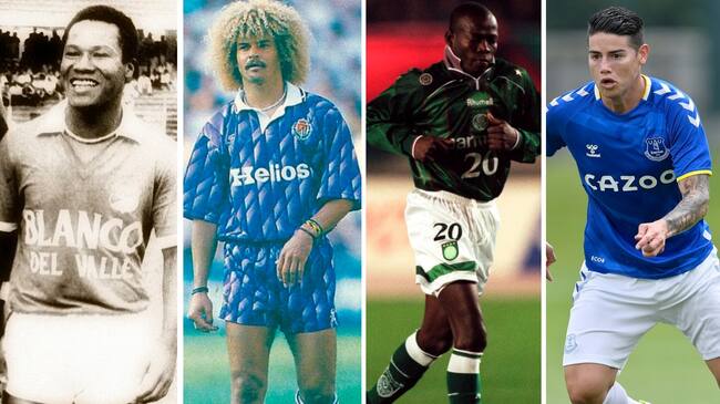 Willington Ortiz, 'Pibe' Valderrama, Faustino Asprilla y James Rodríguez / @AsoDeporCali, @realvalladolid, Getty Images y @EvertonESP