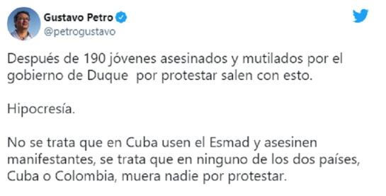 "Después de 190 jóvenes asesinados y mutilados por el gobierno de Duque por protestar salen con esto. Hipocresía. No se trata que en Cuba usen el Esmad y asesinen manifestantes, se trata que en ninguno de los dos países, Cuba o Colombia, muera nadie por protestar", escribió Petro en su cuenta de Twitter.