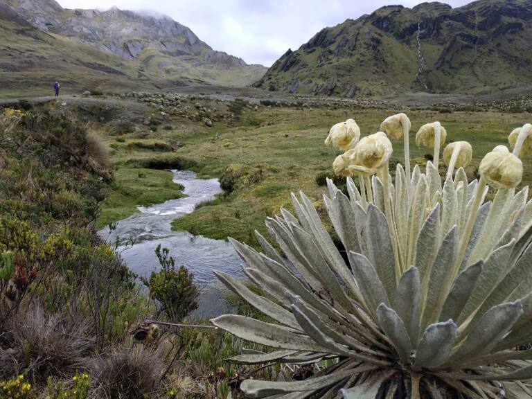 Algunos de los principales componentes ambientales del páramo en una foto: altas montañas, ríos, musgos y frailejones.