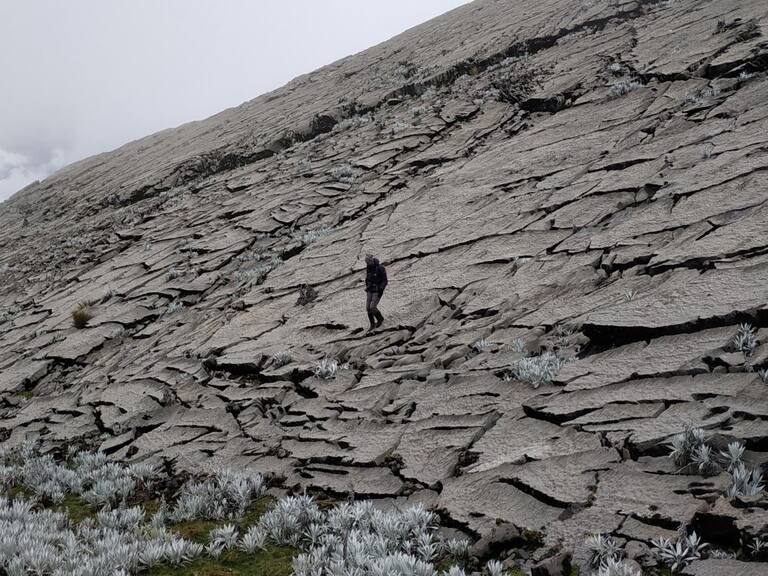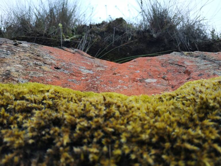 Capas del suelo en el páramo del Almorzadero: musgos, rocas rojizas y herbazales